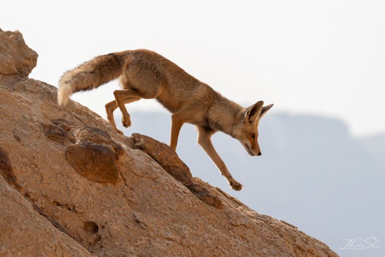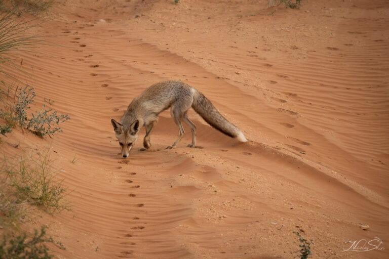 Primarily nocturnal, the Arabian red fox avoids the searing heat of the day by retreating to its burrow, usually dug into sandy or rocky terrain. At night, it emerges to hunt, using its keen senses to detect prey moving under the cover of darkness. Foxes are solitary by nature, coming together only during the mating season between December and February. A female typically gives birth to a litter of 2-5 kits, which remain with her for about six months before venturing off independently.